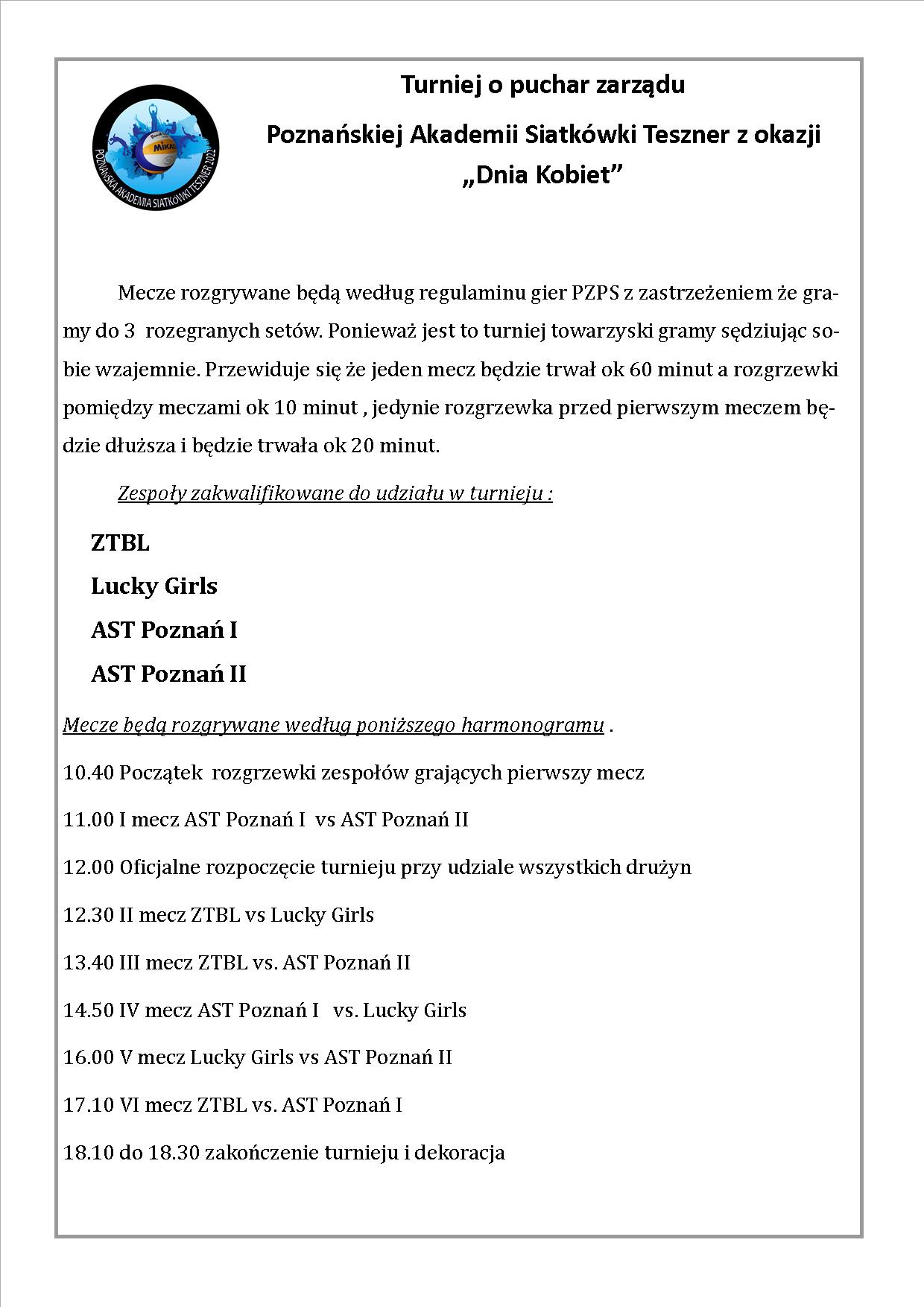 Komunikat organizacyjny na turniej o puchar zarządu Poznańskiej Akademii Siatkówki z okazji Dnia Kobiet