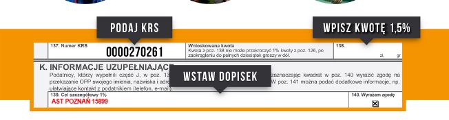 • Aby przekazać 1,5% podatku jaki Państwo przekazujecie do Urzędu Skarbowego wystarczy w składanym zeznaniu podatkowym podać dodatkowe informacje, KRS 0000270261 oraz w rubryce cel szczegółowy podać nazwę i nr AST POZNAŃ 15899. Przeznaczona jest na to specjalna rubryka „Informacje uzupełniające” PIT-36 – poz. 520 – 524, PIT-37 poz. 147 – 151,